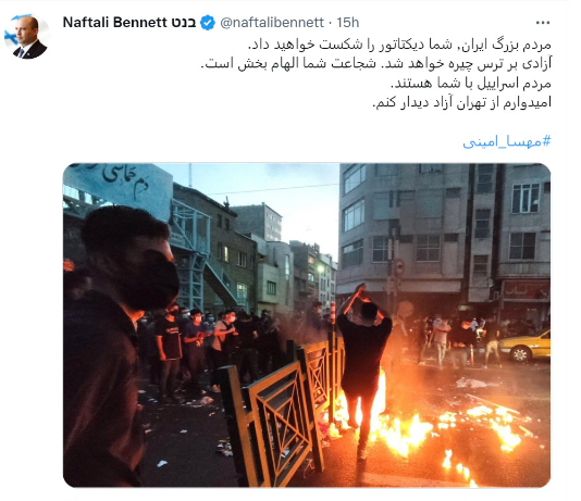 "Великий народ Ирана, вы победите диктатора. Свобода победит страх, ваша смелость вдохновляет. Народ Израиля с вами. Надеюсь, что в будущем сумею посетить свободный Тегеран", - написал на фарси экс-премьер Израиля Нафтали Беннет на персональной странице в Twitter.