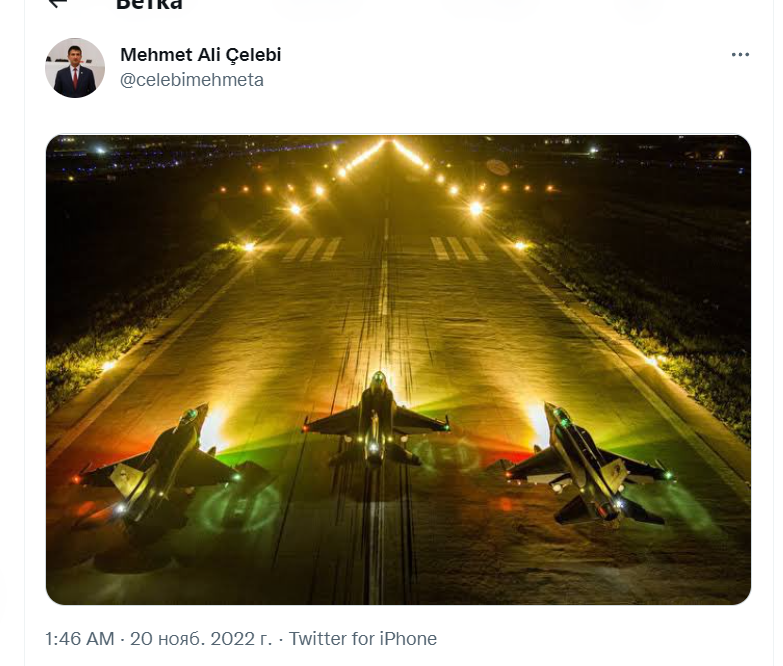 Депутат правящей партии AKP от Измира опубликовкал в Twitter пост с подписью «Однажды ночью» с фото истребителей (Twitter-аккаунт Челеби М.).