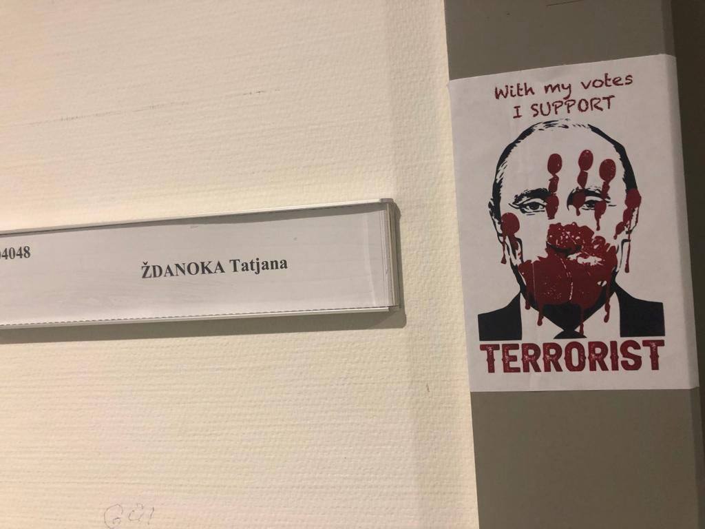 На дверях кабинетов депутатов Европарламента, проголосовавших против признания России спонсором терроризма, наклеили плакаты на которых изображен Путин (ТГ-канал «И грянул Грэм»).