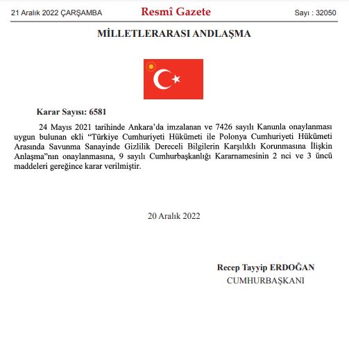 🇹🇷🇵🇱 Турция ратифицировала Соглашение с Польшей о взаимной защите конфиденциальной информации в оборонной промышленности (Официальный вестник Турции).