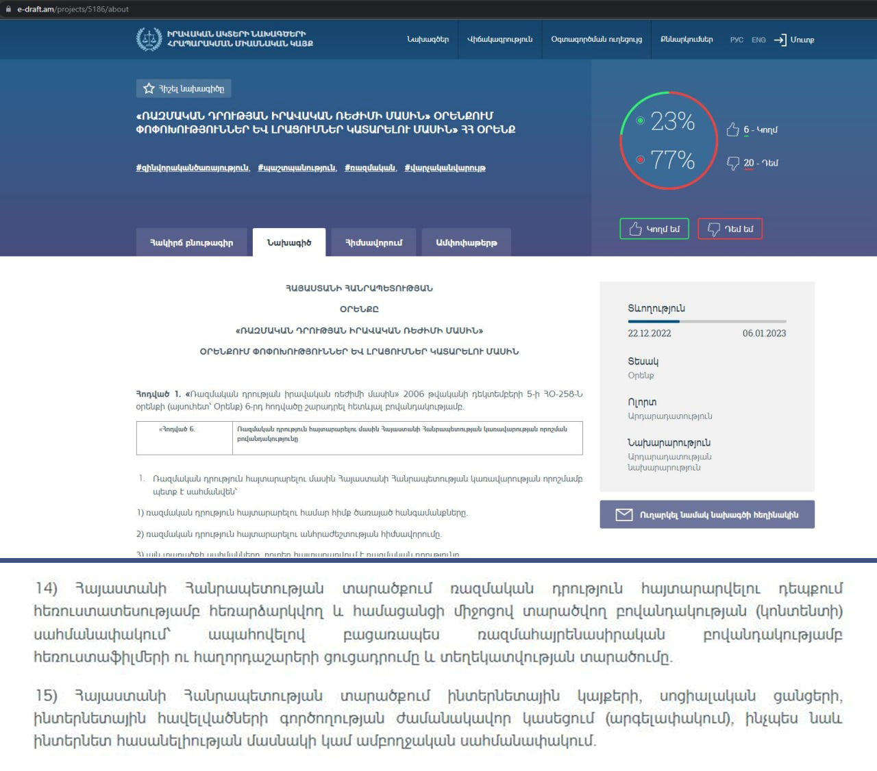 🇦🇲 «В случае объявления на территории Республики Армения военного положения [ввести] ограничение содержания (контента), транслируемого по телевидению и распространяемого через интернет, [а также ввести] обеспечение показа телефильмов и передач исключительно военно-патриотического содержания и распространение информации.