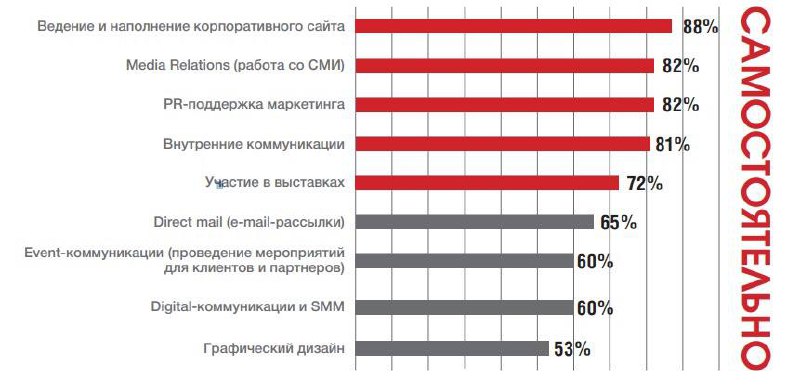 Более 70% респондентов самостоятельно (порой совместными усилиями) ведут и наполняют корпоративный сайт, работают со СМИ (в направлении Media Relations), занимаются PR-поддержкой маркетинговой деятельности, выстраивают внутренние коммуникации и организуют участие компании в выставках.