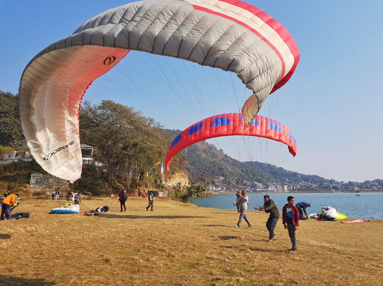 Старт находится на пике возле озера. Высота 1100+ , озеро на высоте 750. Четыреста метров полёта вниз и созерцания гималайских хребтов!