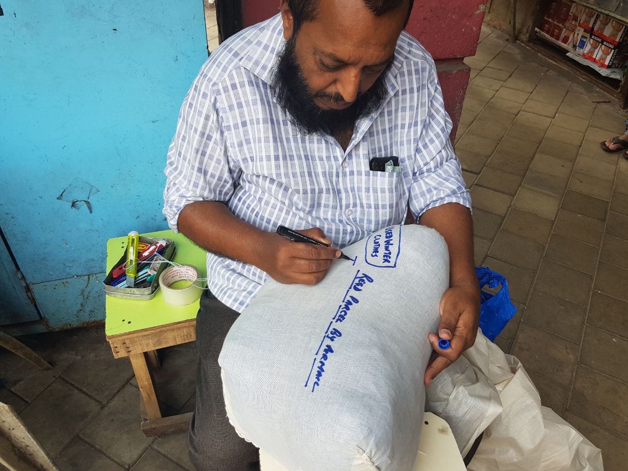 По возвращении к мастеру посылка уже зашита. Маркером он пишет все данные на ткани, берет 200 рупий и отправляет обратно в красивое здание почты.