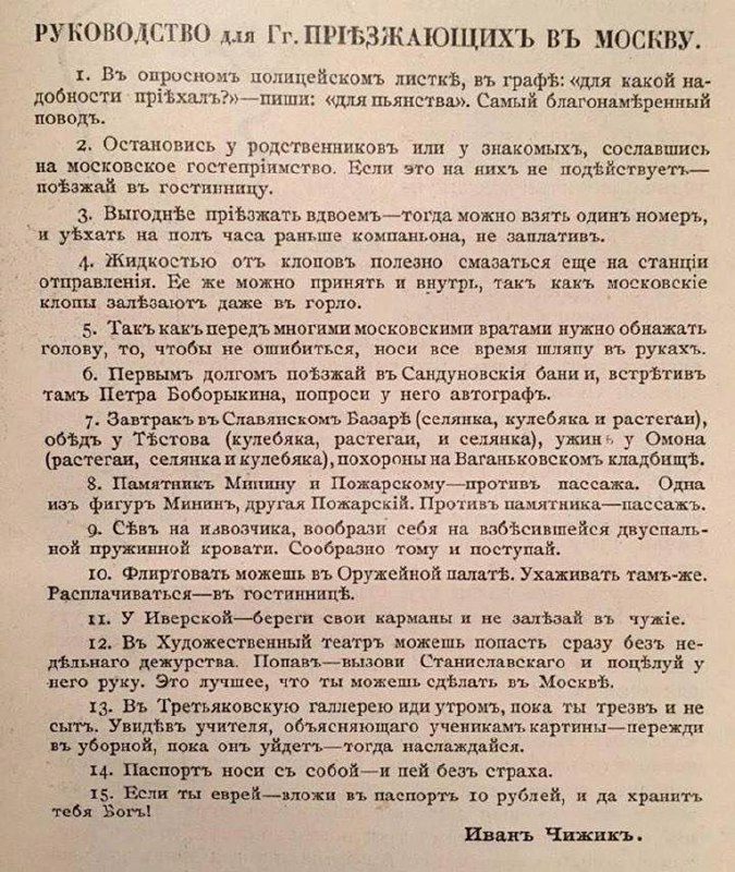 Сегодня утром, мой друг прислал забавную сатирическую статью 1909 года, которую написал российский поэт Саша Черный. Делюсь и я с вами: Дореволюционное руководство для приезжающих в Москву.