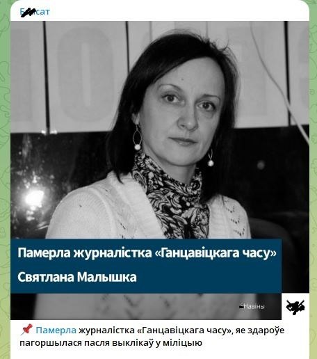 17 сентября 2023 года на 44-году скончалась жительница г.Ганцевич, корреспондент интернет-издания «Ганцавіцкі час» Светлана Малышко.