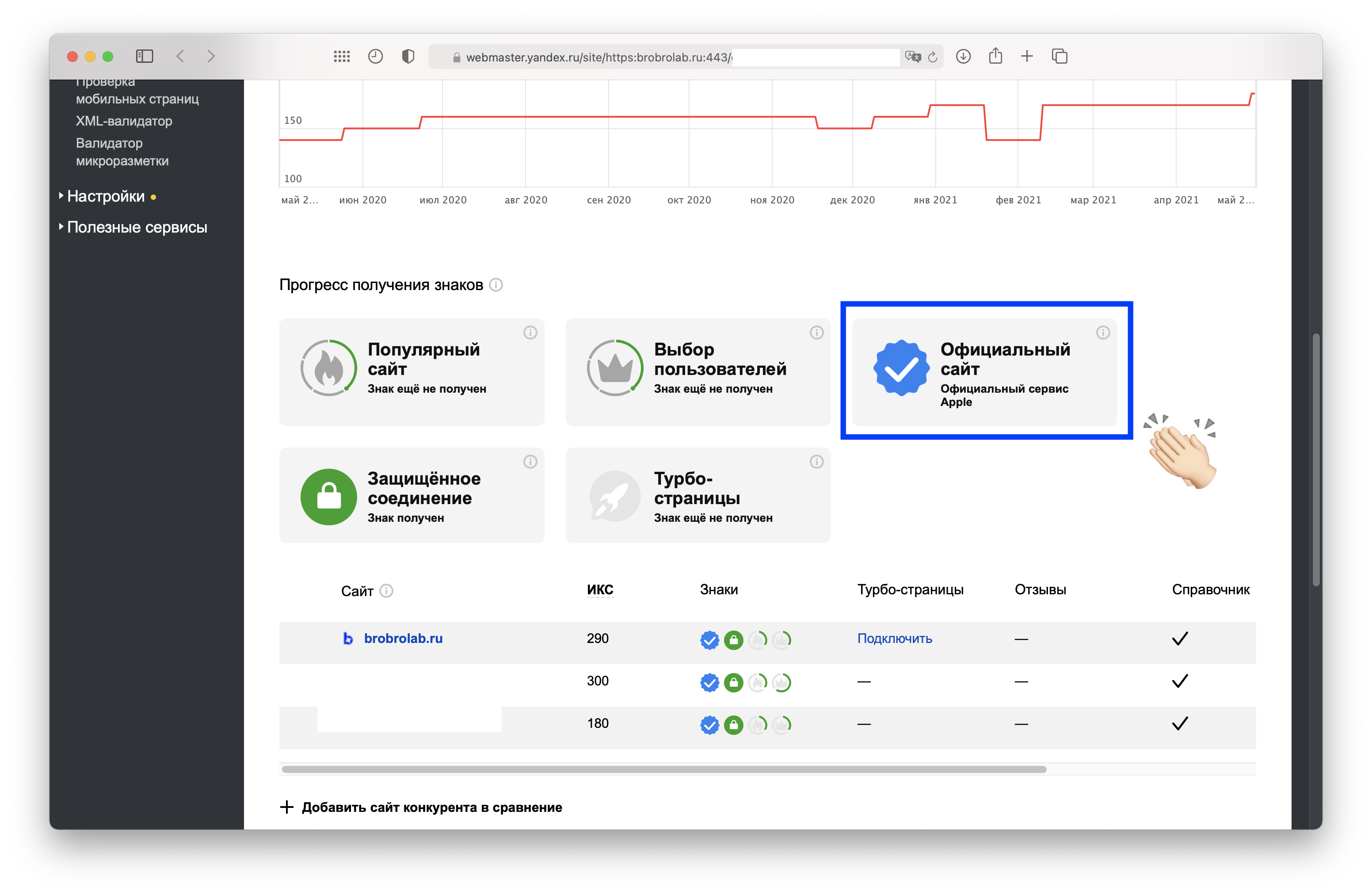 23 марта обнаружили в вебмастере, что этой отметки у нашего сайта нет, а 28 апреля получили. Сразу для всех АСЦ в России. Спустя 36 дней и всего 13 писем. Это очень быстро для таких крупных компаний, не кривлю душой.