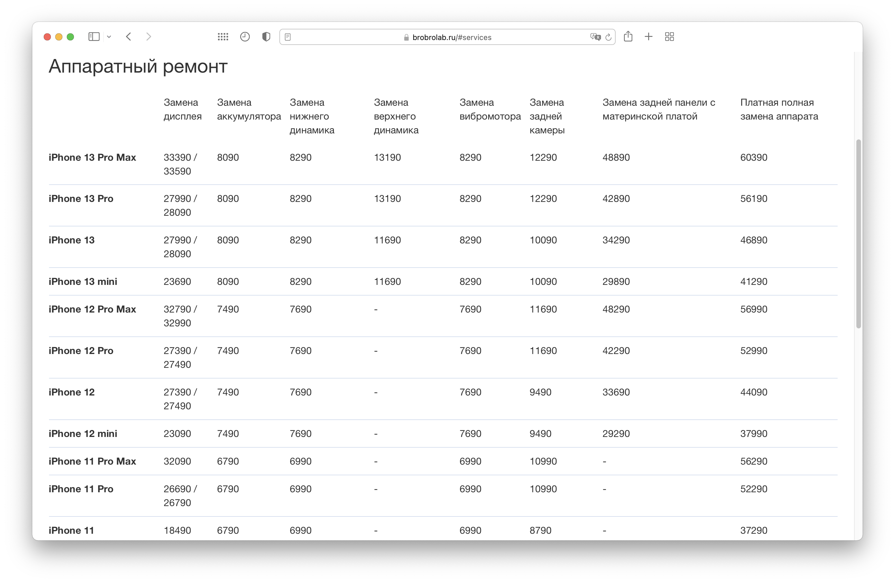 Вот получившиеся прайсы. Как видите, есть все стоимости обслуживания iPhone 13, хотя такой ремонт провести ещё не можем — ждём детали.