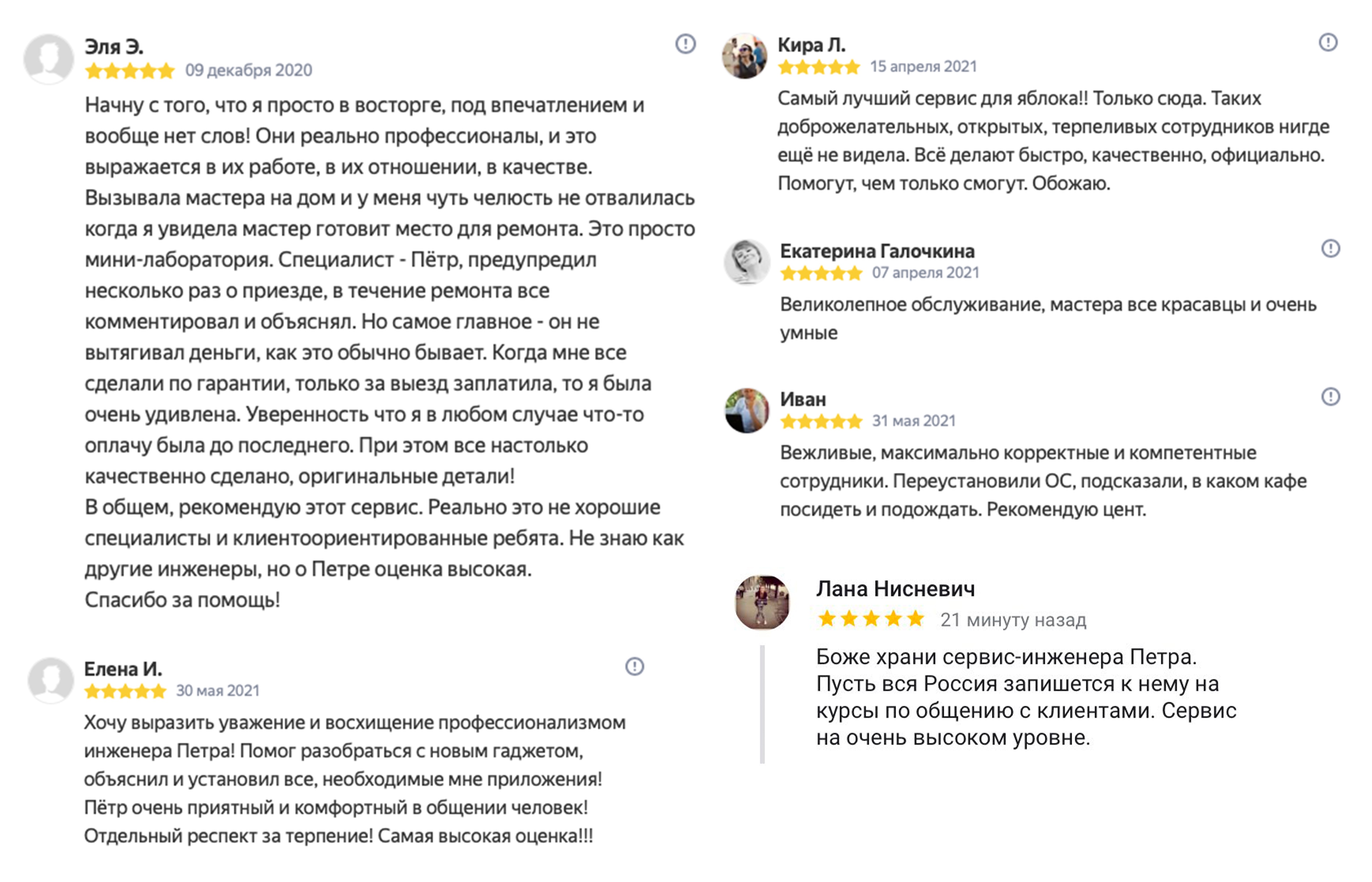 Клиенты оценивают АСЦ. Не надёжность техники Apple, не консультацию AppleCare, а именно нашу работу. Это и хорошо, и плохо. Нам часто «прилетают» негативные отзывы потому, что клиент не разобрался. Перезваниваем, уточняем и оказывается: мы — красавчики, а вот надёжность устройства расстроила. Впрочем, тут всей правды не узнаешь, люди могут стесняться сказать в лицо, у нас это в менталитете.