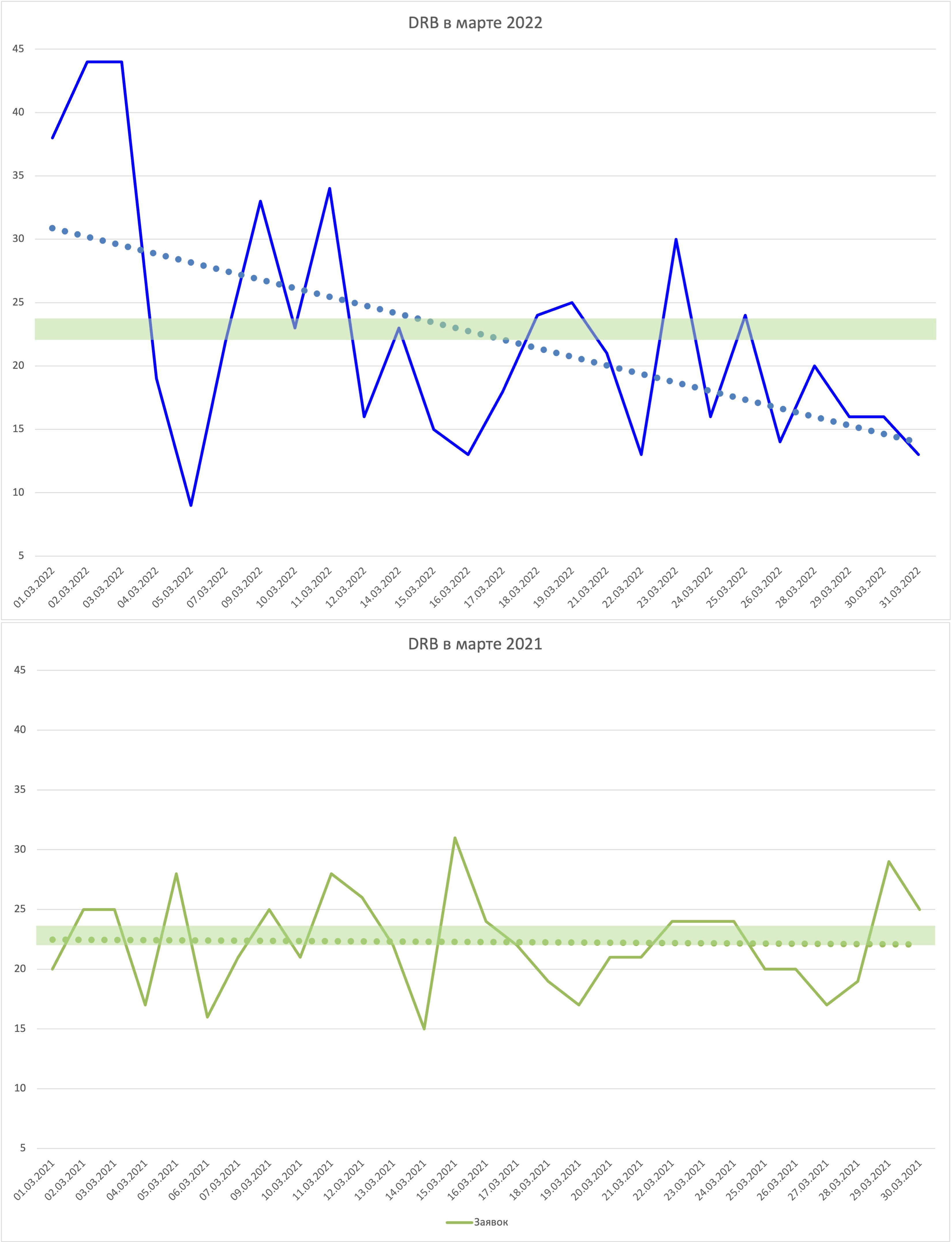 На картинке — динамика клиентских обращений физ. лиц. в марте этого и прошлого года. Салатовый блок в центре — ориентировочное количество обращений, при котором достигаем безубыточности, если средний чек и фонд оплаты труда остаются прежними. Пунктирная линия — тренды.
