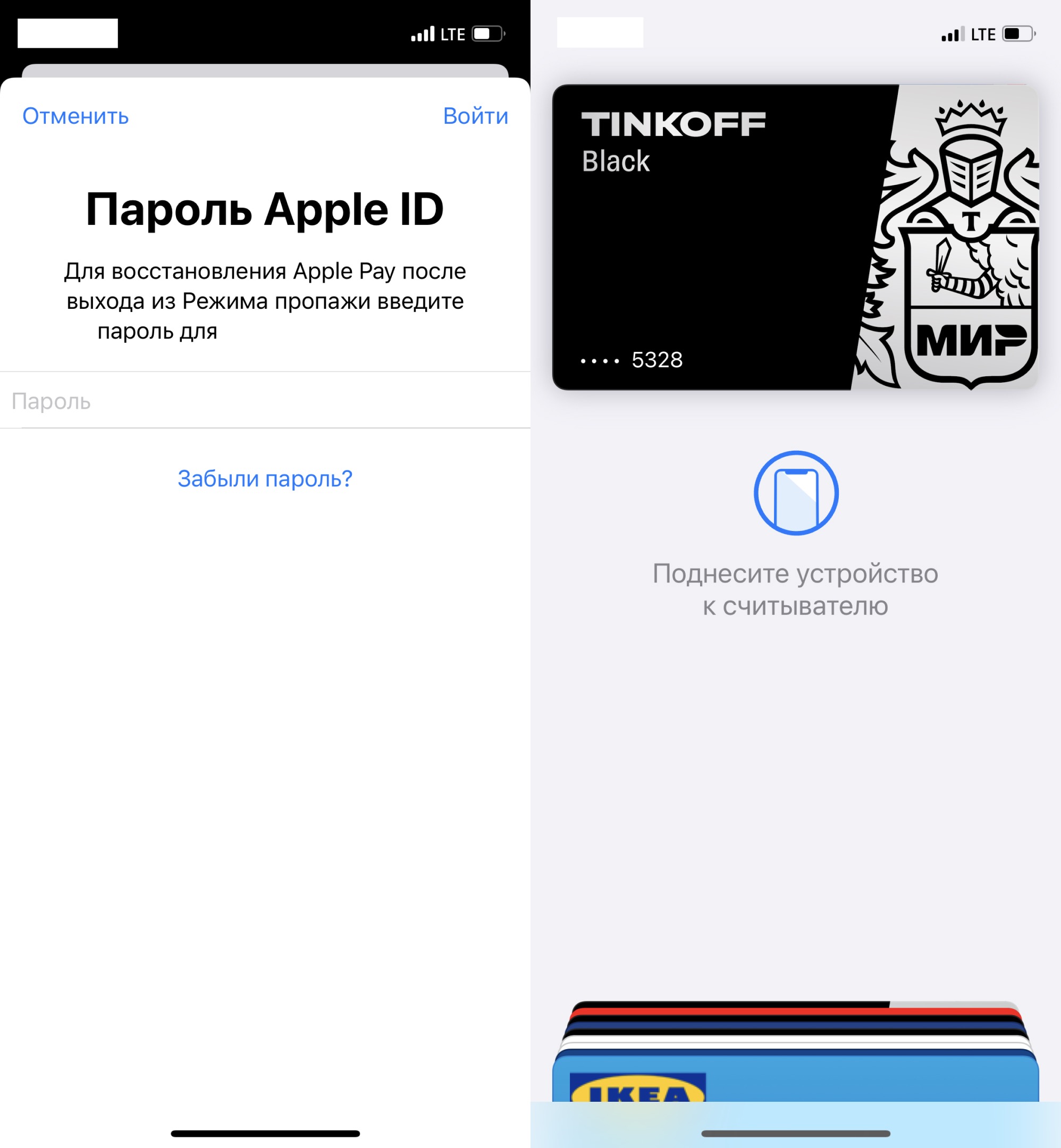 3. Вводим код-пароль и пароль от Apple ID на устройстве — устройствро разблокируется и продолжит работать как обычно, но заблокированные карты «Мир» станут активными.