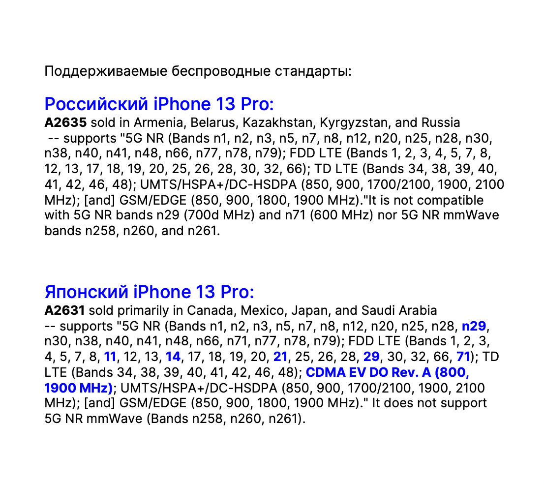 Вместо российских iPhone 13 Pro, модель A2635 и iPhone 13 Pro Max, модель A2640 привезли японские A2631 и A2483. Последние поддерживают больше диапазонов беспроводной связи, Apple не ввозит в Россию такую технику, для стран СНГ — свои модели.