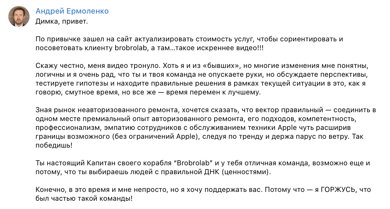 Неожиданный эффект запущенной кампании — слова благодарности и поддержки. За последнюю неделю получил не меньше 5 сообщений, которые читаешь и вдохновляешься, а энергии прибавляется. Одно из таких от Андрея Ермоленко, прикладываю в конце.