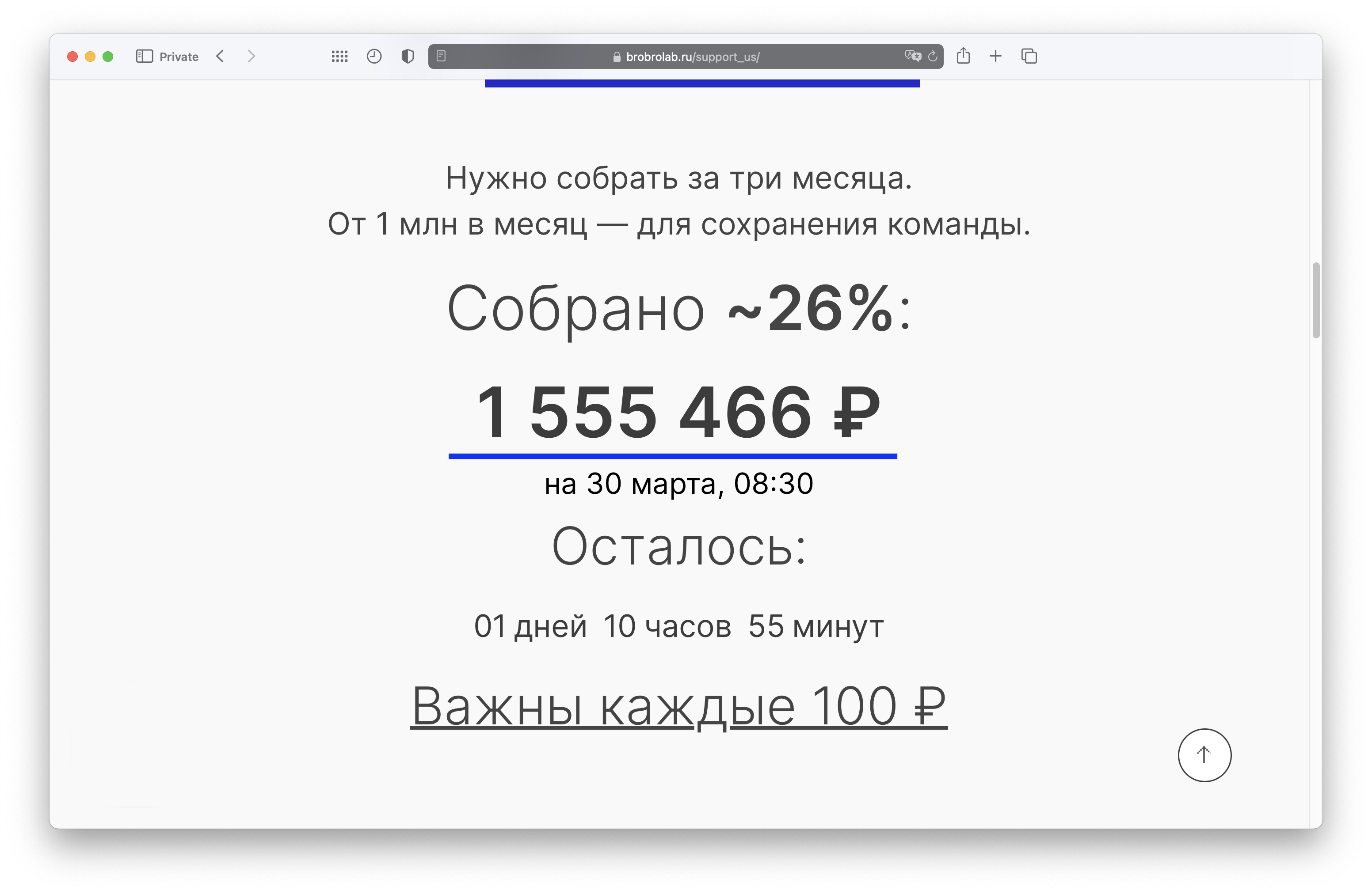 На момент публикации кампания привлекла 1 555 466 ₽. Это вчетверо меньше требуемой суммы и приблизительно вчетверо выше суммы, которую ожидали скептики в нашем коллективе.