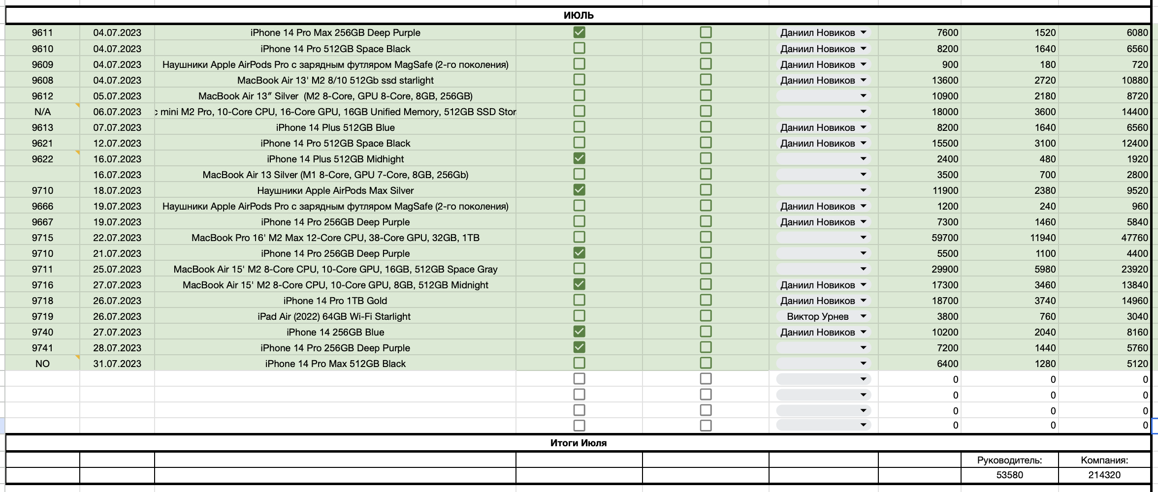 В этой публикации — отчёты по продажам за июль Даниила Новикова и Антона Коротеева, ответственных за продажи проверенной и новой техники соответственно. Ребята отправили их ещё 01 августа, только добрался убрать служебные ссылки.