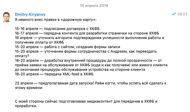 Поэтому с Андреем наметили «дорожную карту». Это инструкция для самих себя: кто что делает и в какие сроки. Сегодня придерживаемся этого приёма постоянно при разработке и запуске новых проектов, но год назад это было в диковинку. Идею позаимствовали у М.Видео, когда открывали совместный с ними сервис.