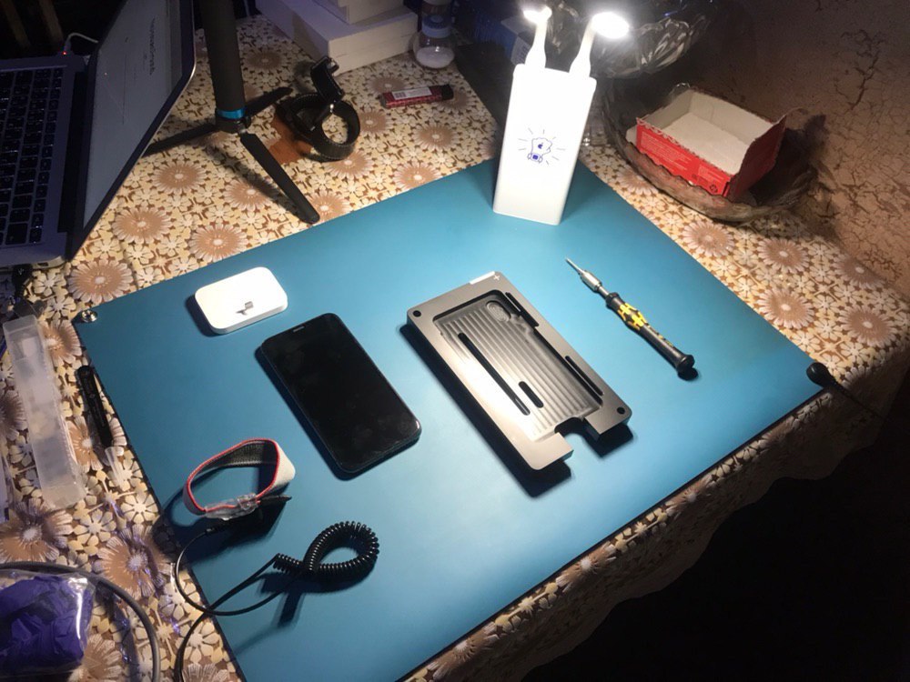 Работали на кухне. Было тесно и темно, поэтому сразу после выезда добавили в кейс 2 штуки Xiaomi Mi LED Portable Light 2 White, это светодиодный яркий фонарик, подключаемый к USB. Такие корректировки неизбежны, но восхищала общая стройность и проработка процедуры, которую выполняли впервые.