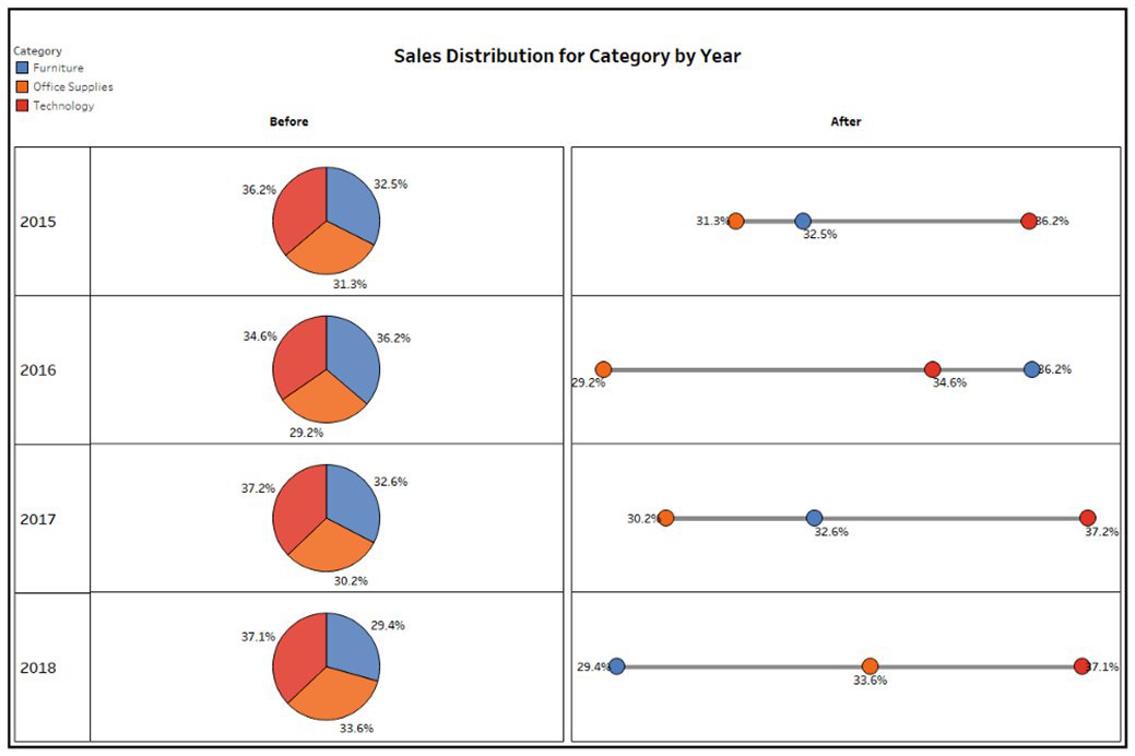 Одним из наиболее распространенных способов не весьма удачного использования круговых диаграмм, является использование многих из них вместе для отображения изменений во времени или по категориям. Если основная мысль, которую вы хотите донести своему зрителю, является вариацией, полезно знать, что люди действительно хороши в обнаружении и оценке расстояния между объектами. Диаграмма гантелей, также известная как диаграмма ДНК, является отличным способом показать изменения, используя визуальную длину.
