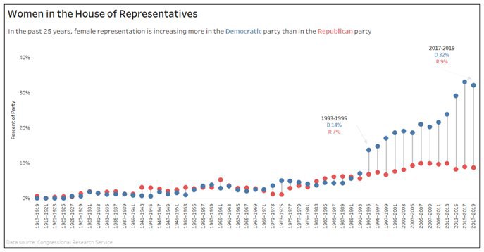 Вот великолепный пример диаграммы гантелей, который отражает увеличение числа женщин в Палате представителей в разрезе партии (США).