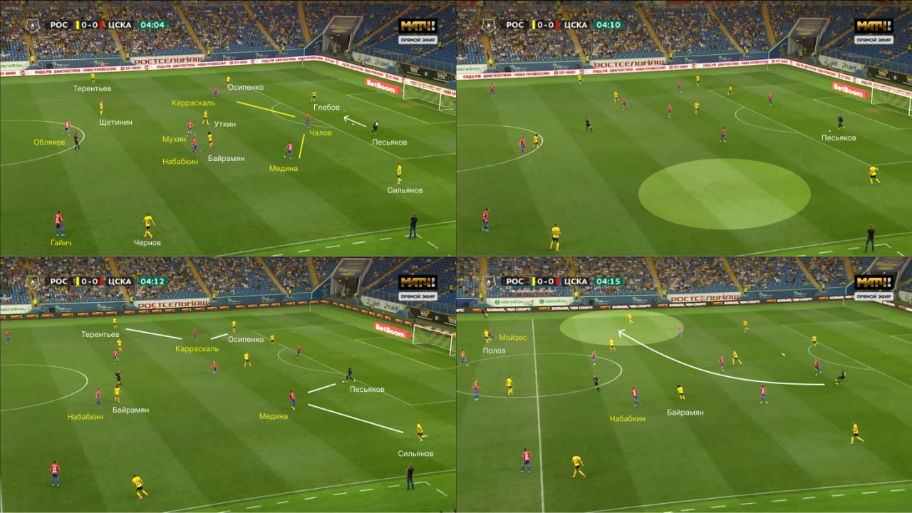 В итоге движение заставило Медину выбирать: прессинговать Песьякова или обозначить давление на Сильянова. В итоге Хесус застыл между вратарем и защитником. Похожая ситуация возникла и на противоположном фланге – Карраскаль был в полупозиции рядом с Терентьевым и Осипенко. Бонус – позиция Полоза, которая увела Мойзеса глубже и освободила фланг для Дениса (3, 4).