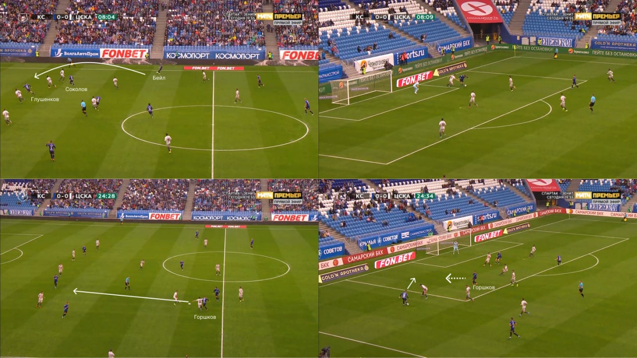 В первом тайме понравилось продвижение от Горшкова и Бейла. Латерали «Крыльев» организовали несколько быстрых атак с заходов в штрафную.