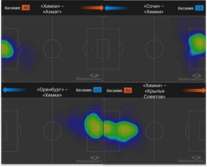 Кажется, пока рано делать выводы, но озвучить пару наблюдений вполне разумно: прессинг «Крыльев» позволял Лантратову становиться третьим центральным при владении (Волков поднимался в опорную зону), из-за чего количество действий с мячом постепенно растет (ниже заметно на тепловой карте), но с пенальти есть вопросы – показалось, что вратарь немного ошибся, когда накрывал Ежова.