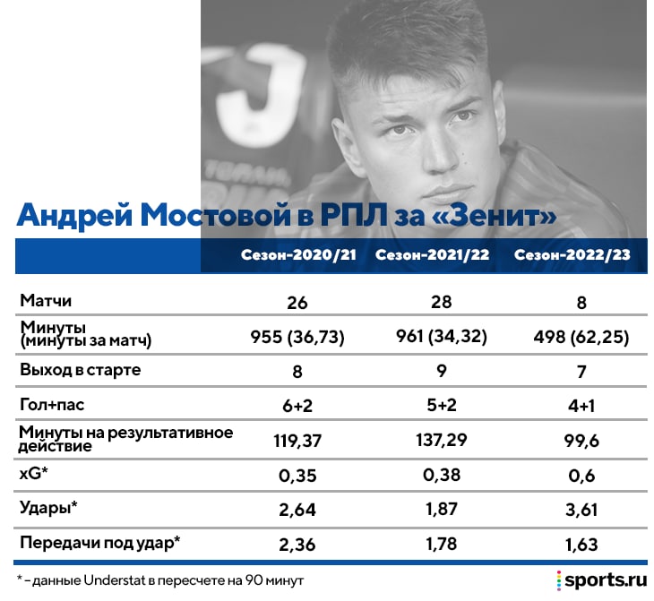 Андрей Мостовой проводит лучший отрезок в «Зените»: за восемь туров отыграл почти половину нормы из прошлых сезонов. Минуты – в таблице ниже, а в старте Андрей вышел 7 раз из 8 (за весь прошлый чемпионат – 9, за позапрошлый – 8). И ведь полезно: часто угрожал воротам, копил результативные действия. Еще никогда он не играл за «Зенит» так стабильно и эффективно.