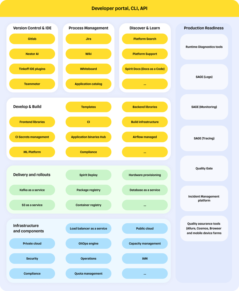 Ну и начнем мы с того, что у нас внутри компании есть developer ecosystem, которая представлена PaaS платформой Spirit, которая состоит из большого количества составляющих. Но начать надо с принципов, которым ребята следуют при создании платформы