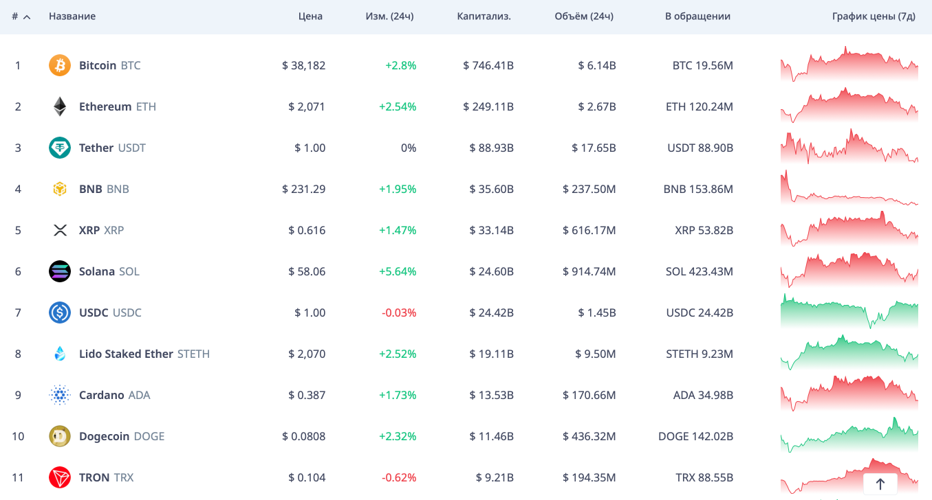 ТОП был составлен на основе рейтинга coinmarketcap. На coingecko и cryptorank он немного другой, потому что они учитывают капитализацию STETH — сейчас этот токен находится на 8 месте среди всех криптовалют. Прикрепили к посту скрин с учётом этого токена ↓