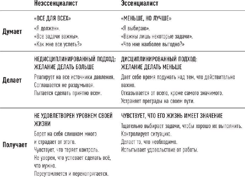 За последний год стало особенно заметным стремление людей везде успевать. Всегда и всему говорить «да» и в итоге терять фокус и выгорать. В книге Грега МакКеона такие люди названы неэссенциалистами. А эссенциалисты как раз понимают, что на все возможности и дела не хватит времени и ресурсов, и потому выбирают не больше занятий а, занятия, важные здесь и сейчас. По таблице ниже вы сможете лучше понять разницу между эссенциалистами и неэссенциалистами. А мы переходим к инсайтам.