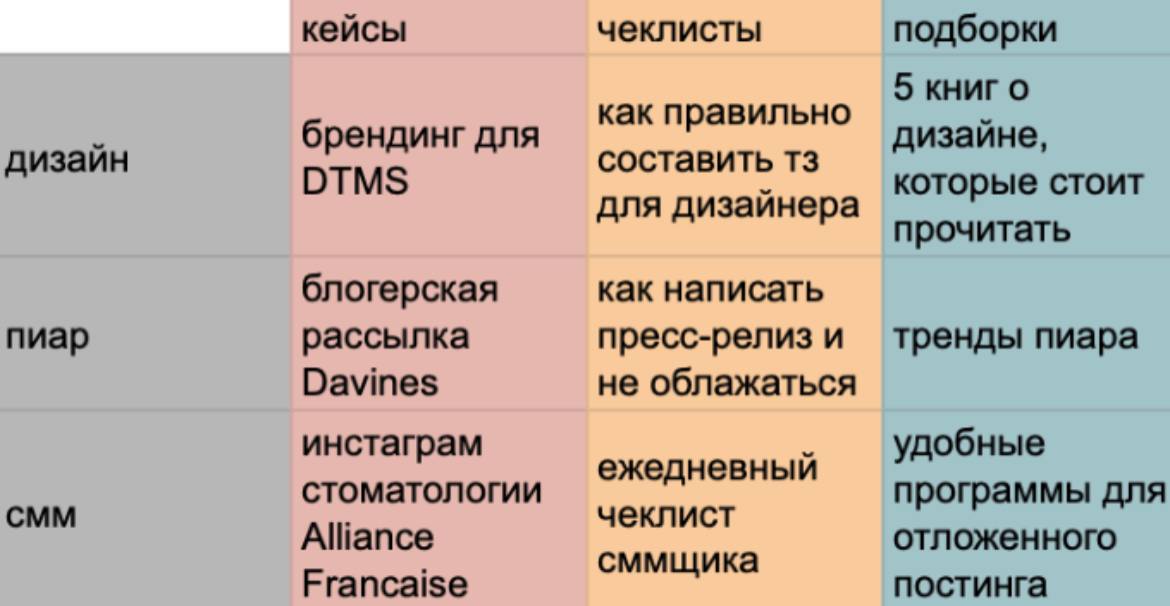 - Горизонталь: сюда прописываем форматы публикаций – в нашем случае это, например, кейсы, чеклисты, полезные подборки.