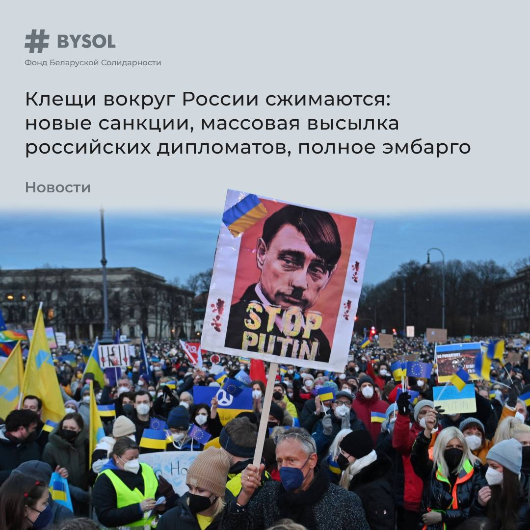 Западные страны планируют новые жёсткие санкции, одна за другой объявляют о высылке российских дипломатов и практически полном разрыве дипломатических отношений. Причём делают это и недавние лоббисты интересов Кремля. Высылает более 30 российских дипломатов и настаивает на полном нефтегазовом эмбарго «главный телефонный переговорщик с Путиным» Макрон. Признал полный провал политики умиротворения России один из главных её архитекторов — немецкий президент Штайнмайер. ФРГ теперь тоже выступает за жёсткие санкции и высылает 40 сотрудников российского посольства. Тоже самое с Италией, Болгарией, Словакией и другими ещё недавно лояльными России европейскими странам.