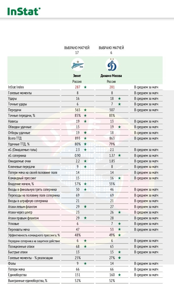 ◾️ яркая игра в атаке - оба коллектива создают по 8 голевых моментов в среднем за матч, это лучшие цифры в лиге с большим отрывом и тут надо отдать должное прогрессу "Динамо" при Шварце. Обычно в этом компоненте с "Зенитом" мало кто мог поспорить,но как будет на дистанции - вопрос!🤔