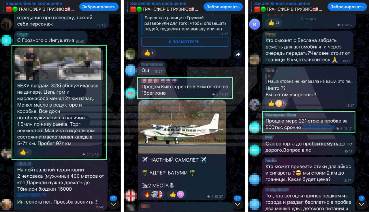 Оголошення почали з'являтися у телеграм-чатах, присвячених від'їзду до Грузії. Власники авто вказують не лише ціну, а й відстань їхніх автомобілів до пропускного пункту. При цьому вибір у покупців широкий: від Kia до Mercedes.