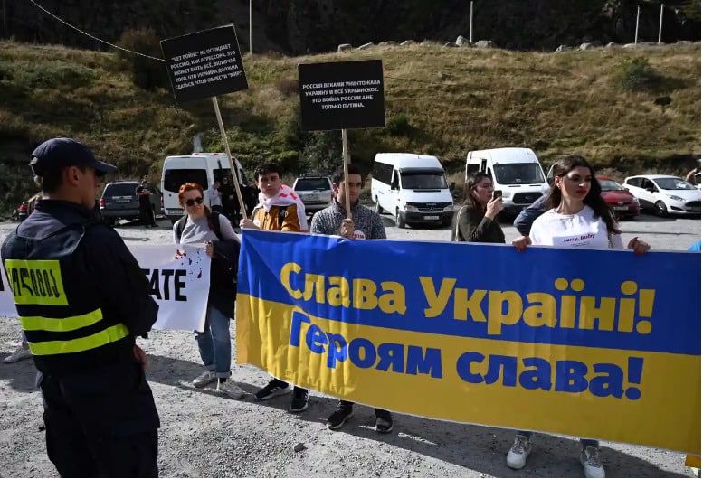 "Росіян, яким вдається виїхати з країни, на кордоні з Грузією зустрічають антивоєнні протестувальники з українськими прапорами та плакатами", – ідеться в повідомленні The Guardian.