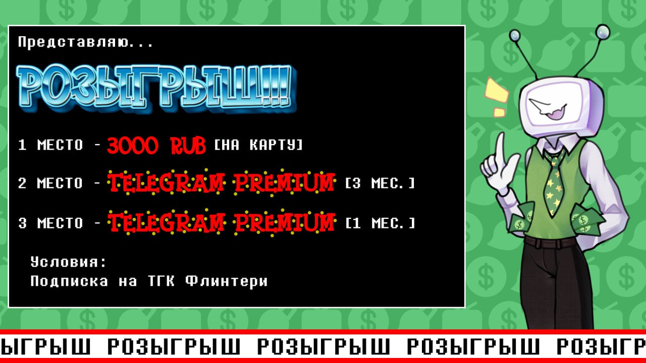 ℹ️ Нажми на кнопочку снизу, чтобы участвовать! ❔ 1 место - 3000 руб. [На карту или любым иным способом]! 2 место - Telegram Premium [3 мес.]! 3 место - Telegram Premium [1 мес.]! 💬Условия розыгрыша: Подписка на "Время Флинтери" - https://t.iss.one/flinterytime…