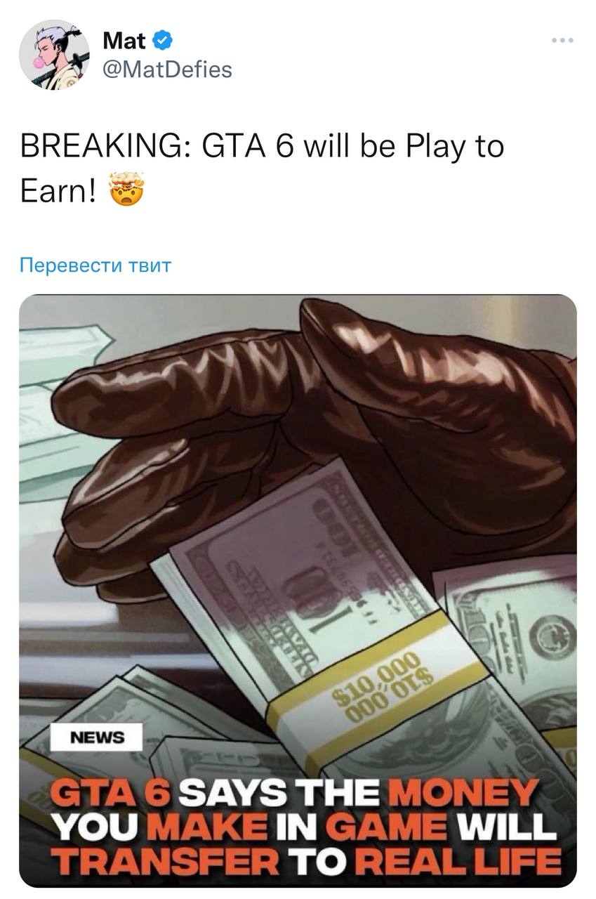 🎮 Сообщается, что 6-я серия игры GTA будет построена на модели Play-to-Earn (т.е. игровые деньги можно будет конвертировать в реальные)