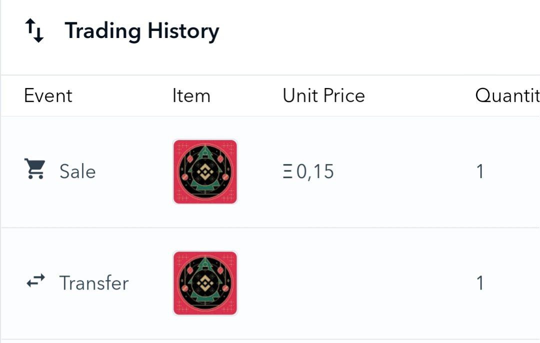 Вот как-раз недавно появился у меня для вас хороший пример. Примерно год у меня на аккаунте лежал NFT BNBAUBLE от Binance. Я не успел продать его сходу, поэтому оставил до лучших времён. Каждую неделю я заходил на площадку OpenSea (на ней торгуются NFT ERC-20) и чекал цены, регулировал свою. Так вот пару дней назад, у меня выкупили этот NFT за 0.15 ETH (21к рублей)💰