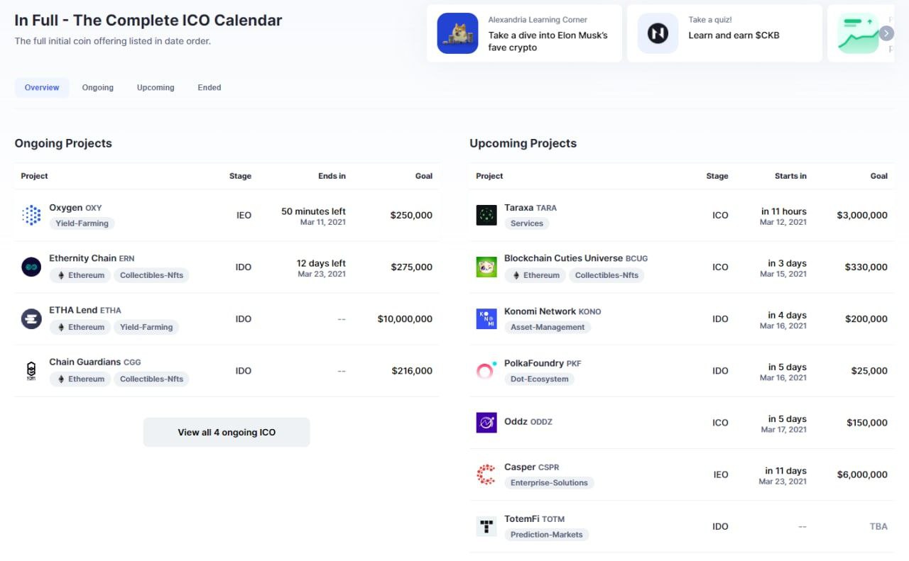 Благодаря этому календарику можно отслеживать идущие и будущие ICO, IDO и IEO, а также информацию о них.