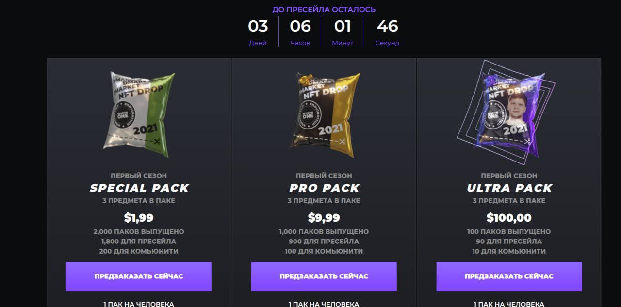 • Сейчас запустился пресейл лимитированных паков. Можно оформить предзаказ на три пака, в каждом паке 3 предмета. Special за 2$, pro за 10 и ultra pack за 100$