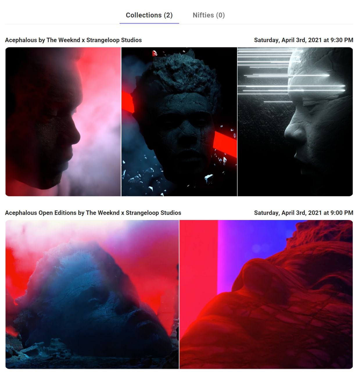 The Weekend представил сразу 2 эксклюзивные NFT коллекции вместе со студии Strangeloop Studios. На самих NFT изображен сам исполнитель, некоторые NFT cопровождаются аудио рядом неизданной песни The Weekend.