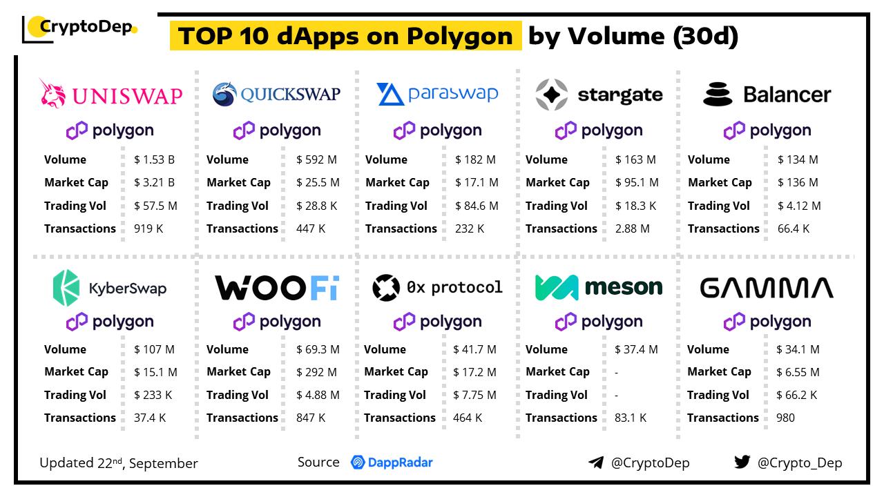 A decentralized application (dApp) is a program built on blockchain that combines a smart contract and a front-end user interface. We present the top dApps on #Polygon by volume in the last 30 days, according to the data from DappRadar.