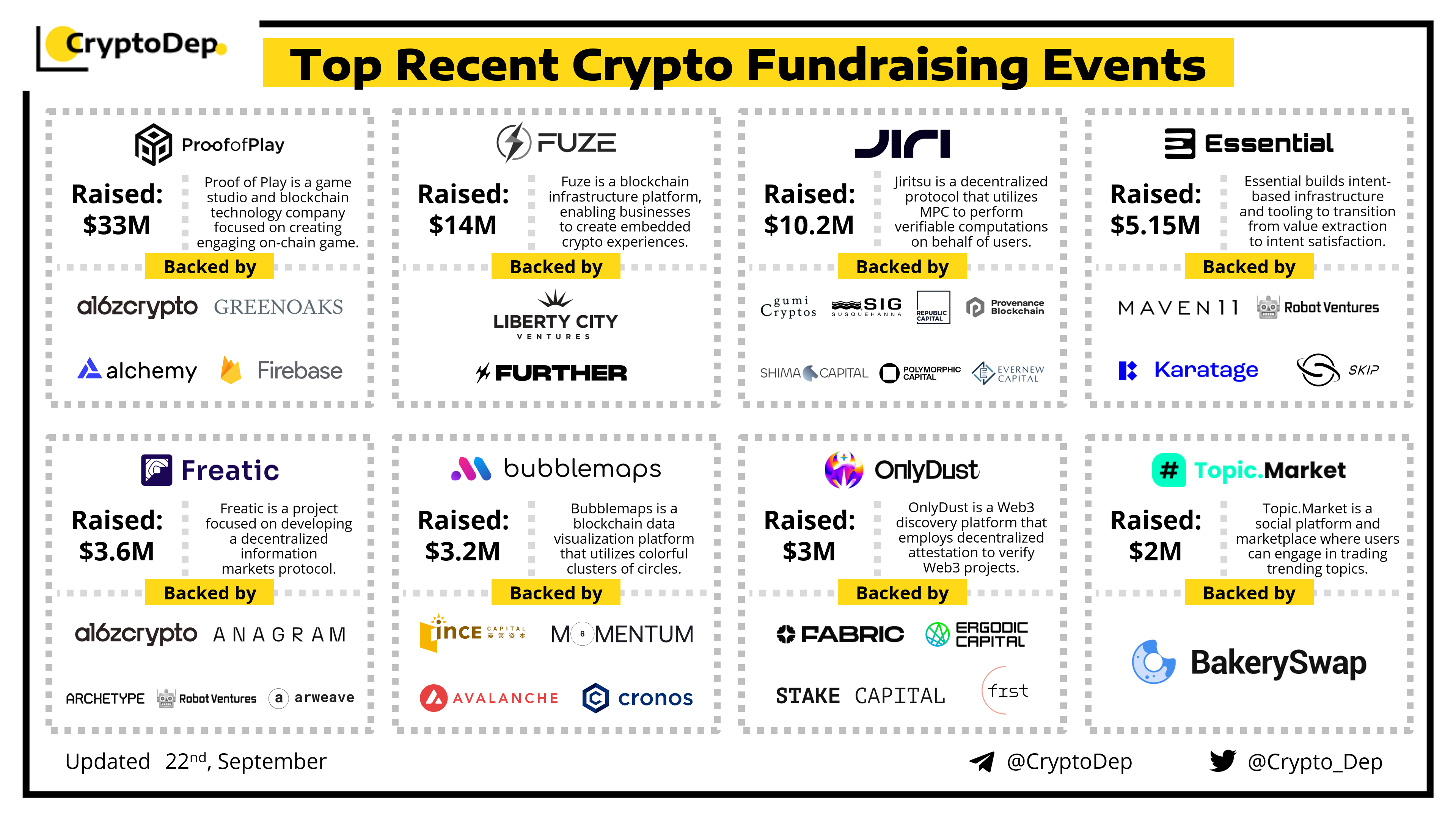 We are excited to present a list of some recent crypto fundraising events, backed by well-known investors such as a16z crypto, Robot Ventures, Shima Capital, Republic Capital, Fabric Ventures, Maven 11, Momentum 6, Avalanche, Cronos, Arweave, BakerySwap, and others. Let's take a look!