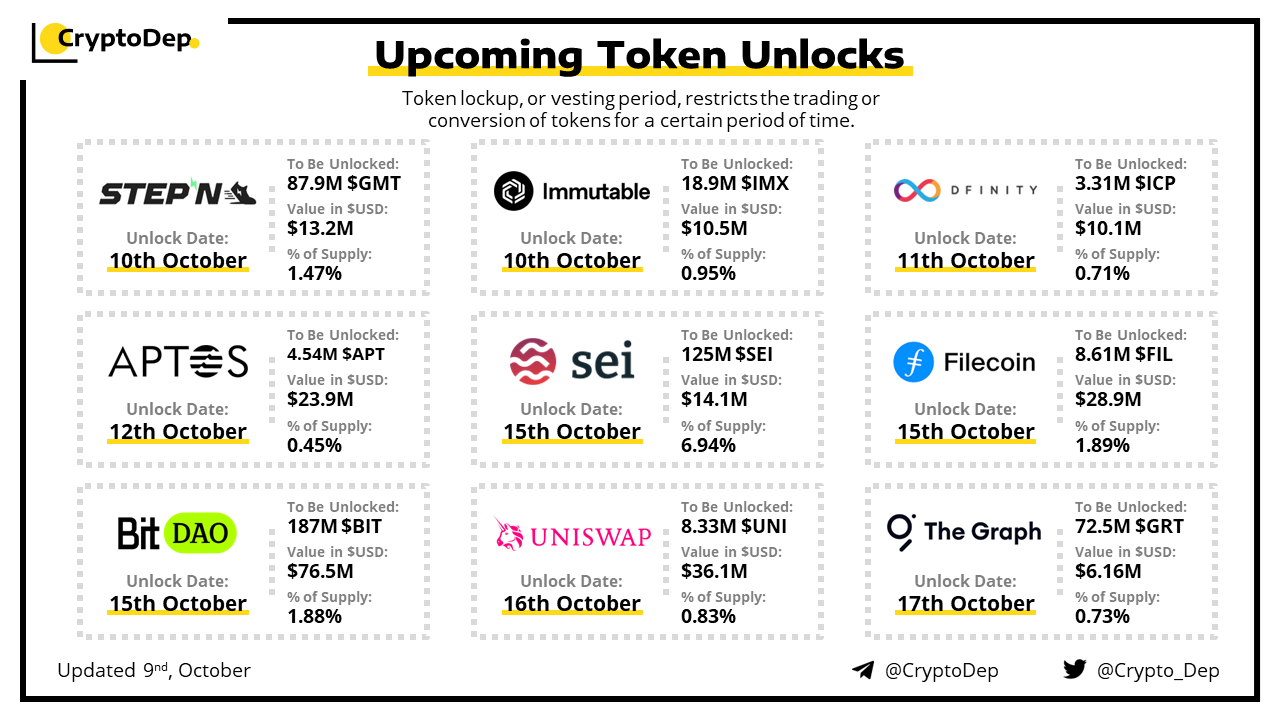 Let's take a look at the compilation of major upcoming token unlocks, diving into details such as dates, amounts, and projects related to tokens that are currently locked up, but will soon be released to the market. During this week, $BIT, $UNI, $FIL, $APT, and $SEI will have the biggest unlocks.