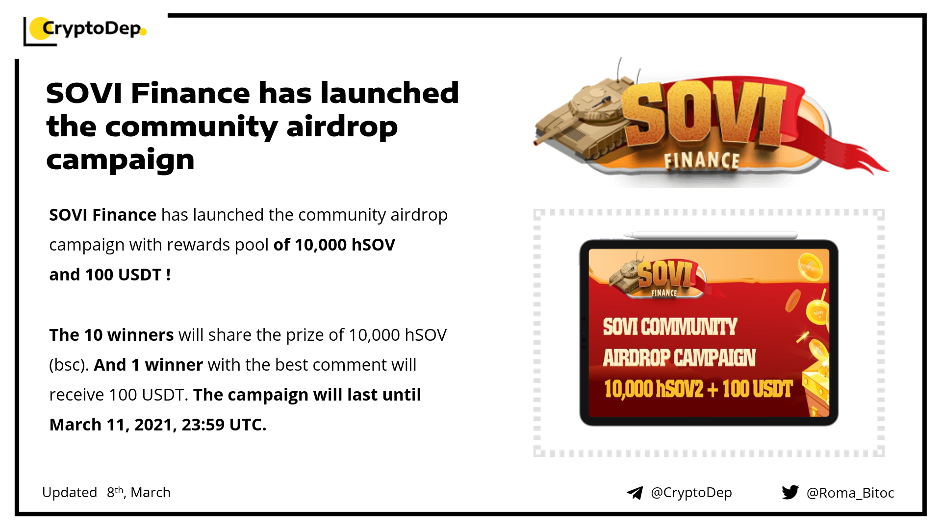 The 10 winners will share the prize of 10,000 hSOV (bsc). And 1 winner with the best comment will receive 100 USDT. The campaign will last until March 11, 2021, 23:59 UTC.