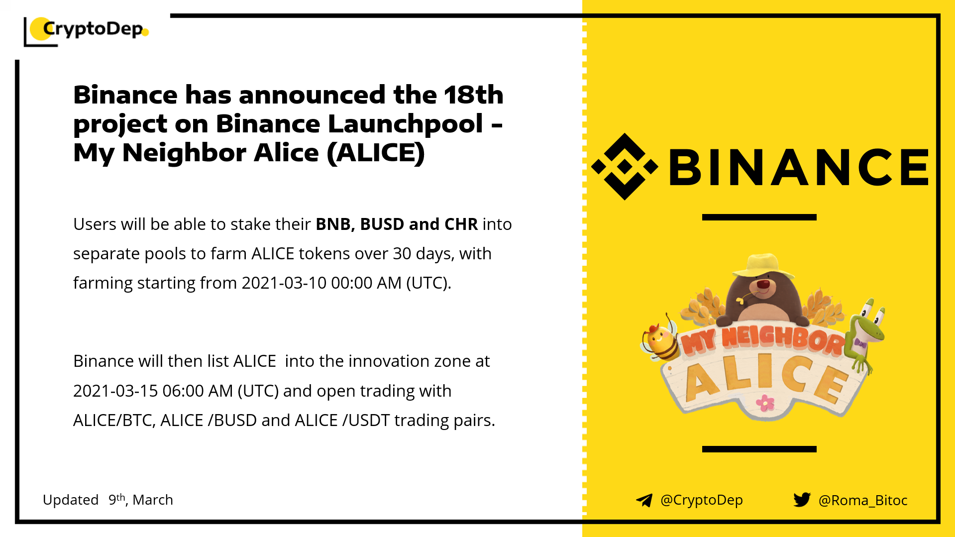 Users will be able to stake their BNB, BUSD and CHR into separate pools to farm ALICE tokens over 30 days, with farming starting from 2021-03-10 00:00 AM (UTC).