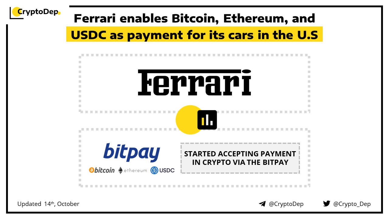 Ferrari has started accepting payments in cryptocurrency for its luxury cars in the U.S. and will extend the scheme to Europe following requests from its wealthy customers. Ferrari has turned to crypto payment processor BitPay for the initial phase and will allow transactions in $BTC, $ETH, and $USDC.