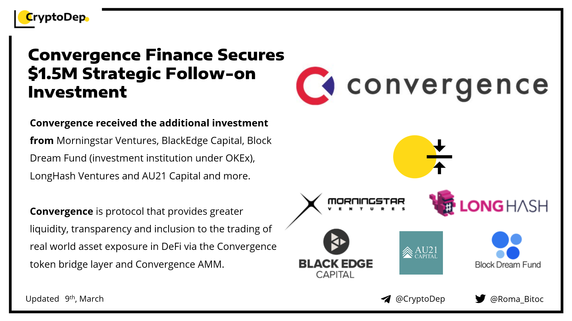 Convergence received the additional investment from Morningstar Ventures, BlackEdge Capital, Block Dream Fund (investment institution under OKEx), LongHash Ventures and AU21 Capital and more.
