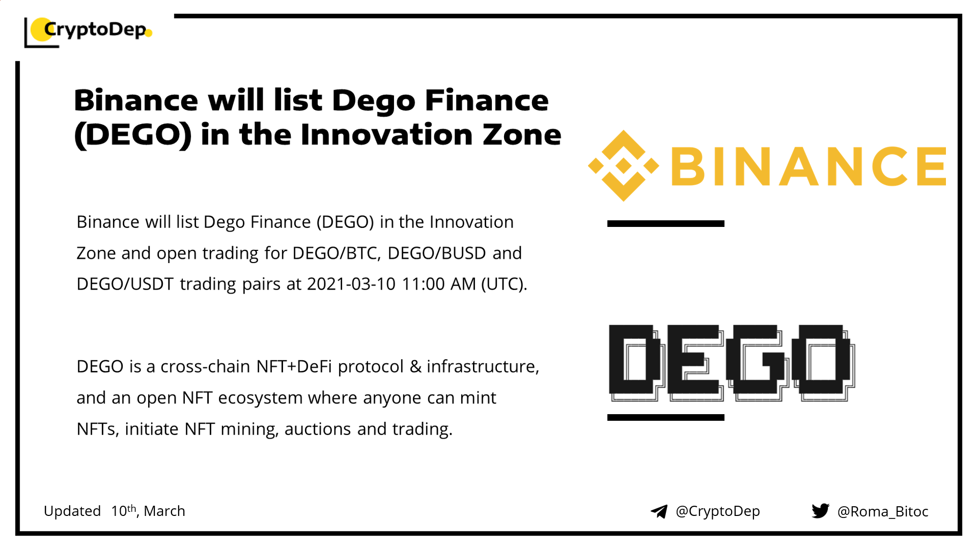 Binance will list Dego Finance (DEGO) in the Innovation Zone and open trading for DEGO/BTC, DEGO/BUSD and DEGO/USDT trading pairs at 2021-03-10 11:00 AM (UTC). Users can continue to start depositing DEGO in preparation for trading.