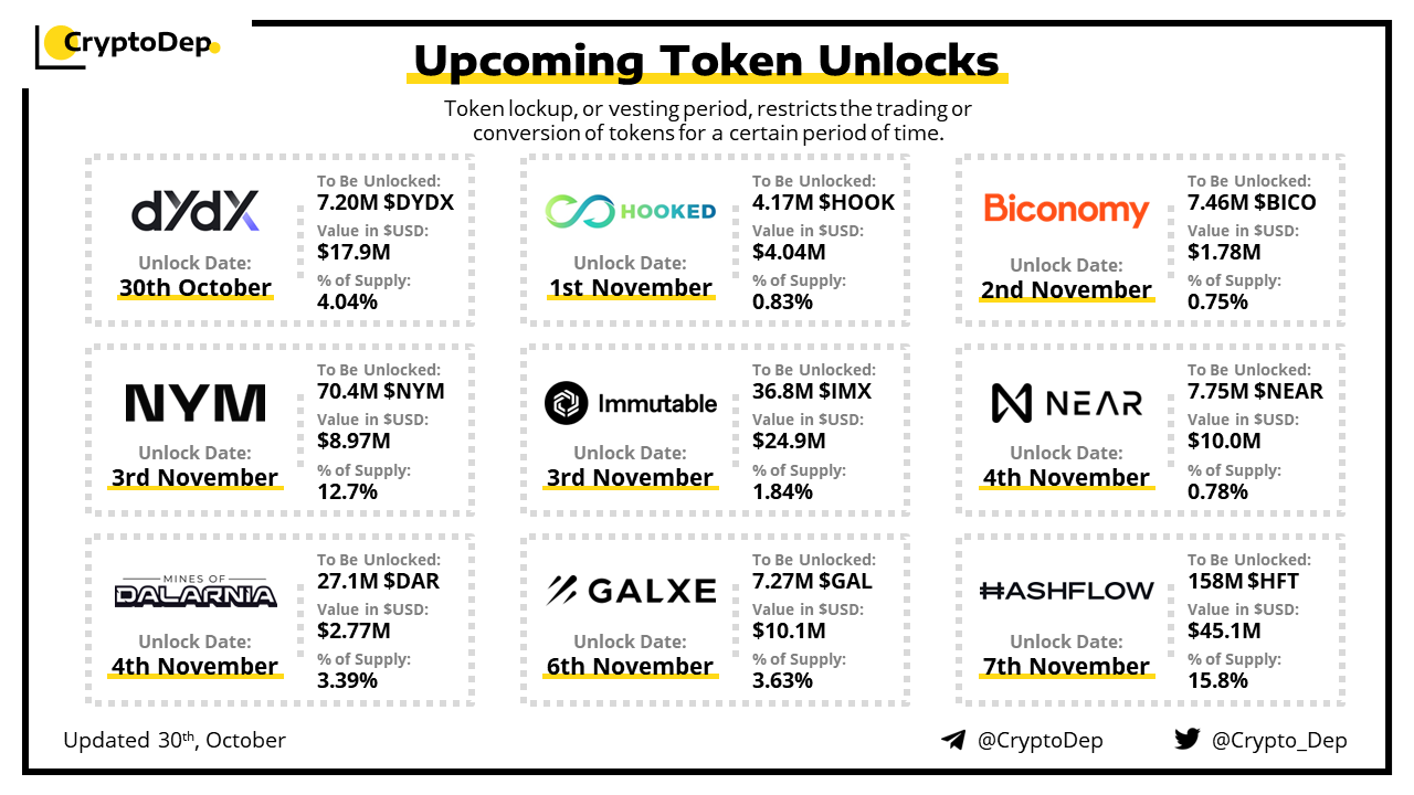 Let's take a look at the compilation of major upcoming token unlocks, diving into details such as dates, amounts, and projects related to tokens that are currently locked up, but will soon be released to the market. During this week, $HFT, $IMX, $DYDX, $GAL, and $NEAR will have the biggest unlocks.